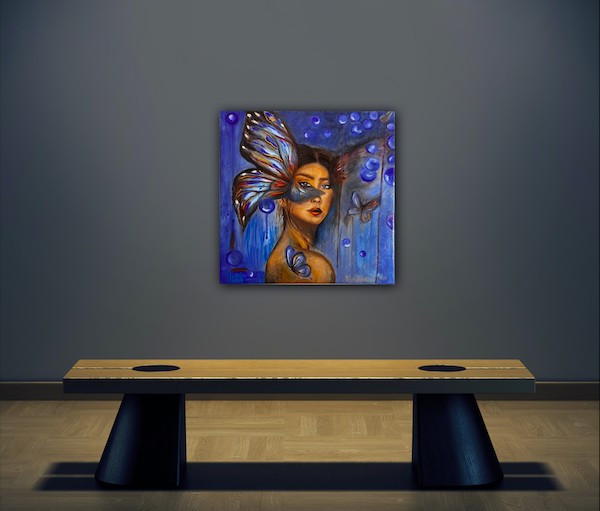 Olejová malba dívky splývající s pozadím, znajíc své místo a cíl, hrdě čelící svému osudu.