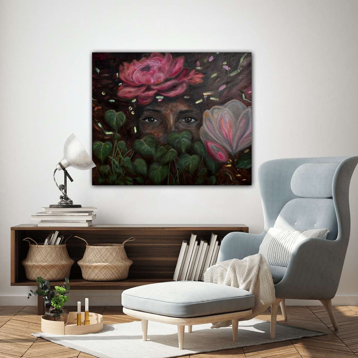 The painting speaks of growth and the emergence of one's own voice. Earthy brown and light green shades are balanced by light and pink spots, creating a feeling of renewal after darkness. It depicts the fascination of female inner strength versus fragility and vulnerability, which is drawn from nature as the main source of energy. The view between the leaves adds depth and mystery.